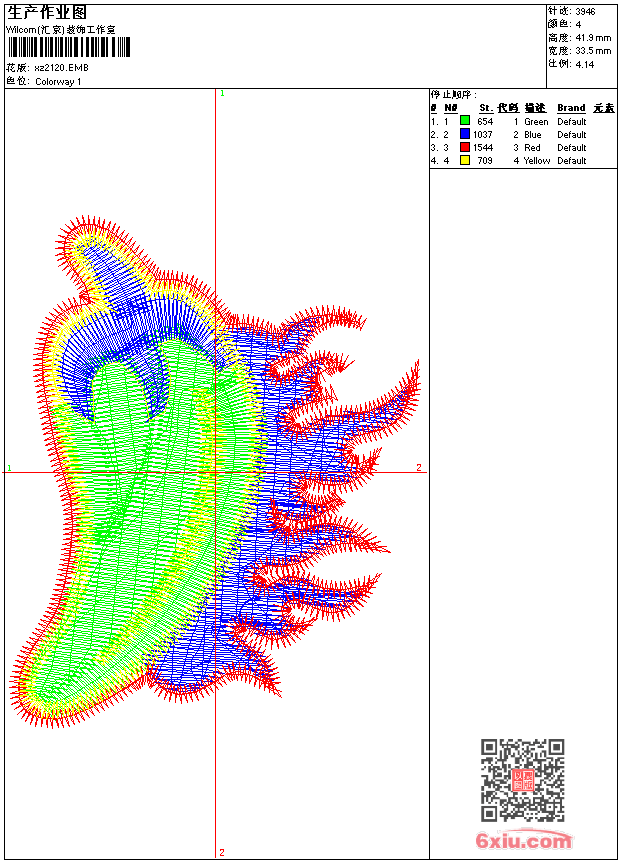 - emb花版参数: 大小:44.00 KB / 尺寸:34*42[毫米] / 针数:3946针 / 线色:4 / 格式:emb / 版本:9