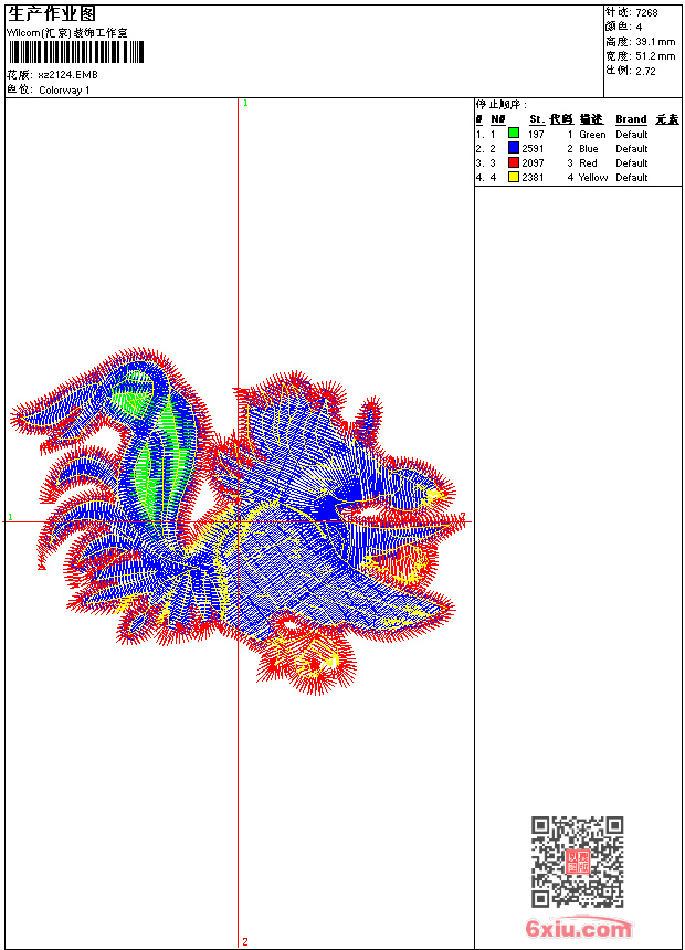 - emb花版参数: 大小:56.50 KB / 尺寸:51*39[毫米] / 针数:7268针 / 线色:4 / 格式:emb / 版本:9
