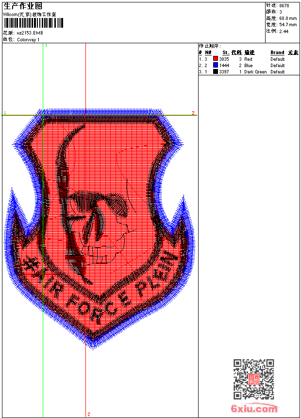 - emb花版参数: 大小:43.50 KB / 尺寸:55*69[毫米] / 针数:8678针 / 线色:3 / 格式:emb / 版本:9