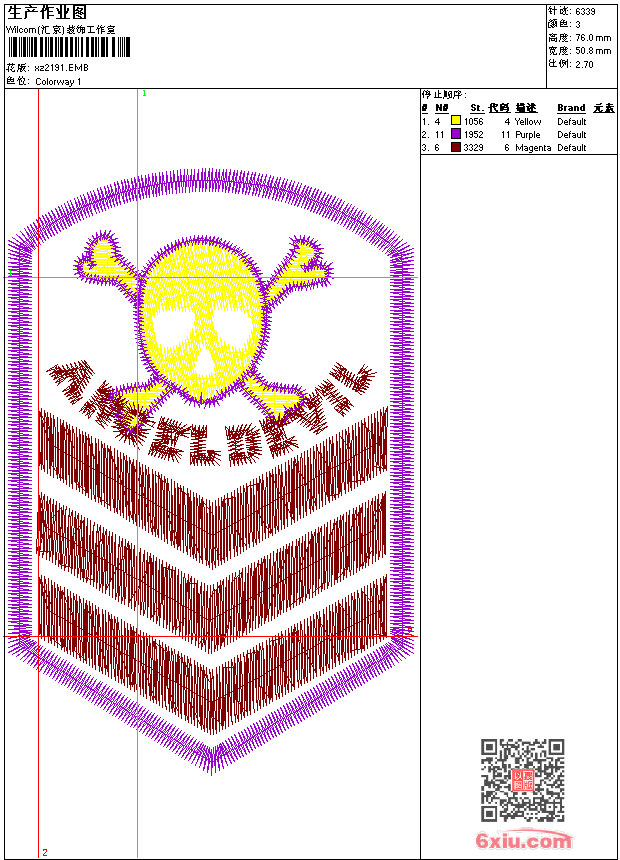 - emb花版参数: 大小:48.50 KB / 尺寸:51*76[毫米] / 针数:6339针 / 线色:3 / 格式:emb / 版本:9