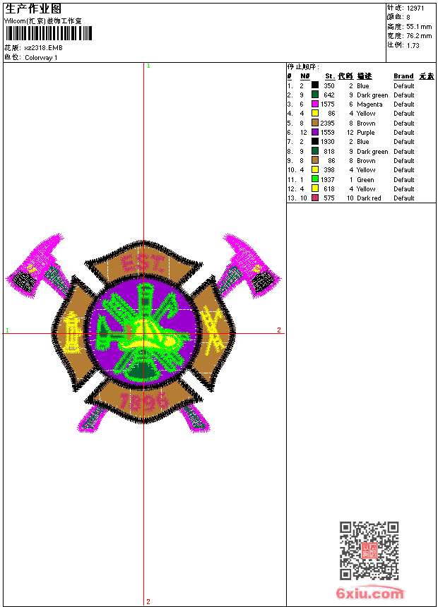 - emb花版参数: 大小:97.50 KB / 尺寸:76*55[毫米] / 针数:12971针 / 线色:8 / 格式:emb / 版本:9