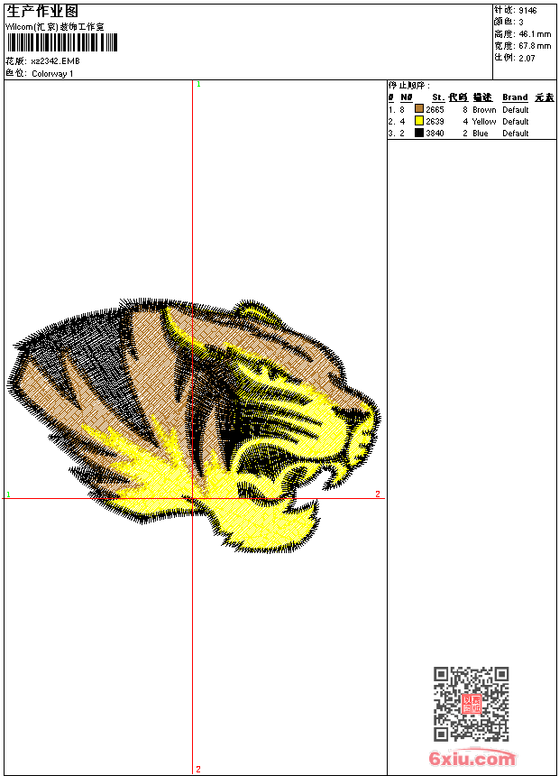 - emb花版参数: 大小:56.00 KB / 尺寸:68*46[毫米] / 针数:9146针 / 线色:3 / 格式:emb / 版本:9
