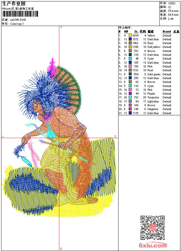 - emb花版参数: 大小:94.00 KB / 尺寸:54*76[毫米] / 针数:12593针 / 线色:12 / 格式:emb / 版本:9