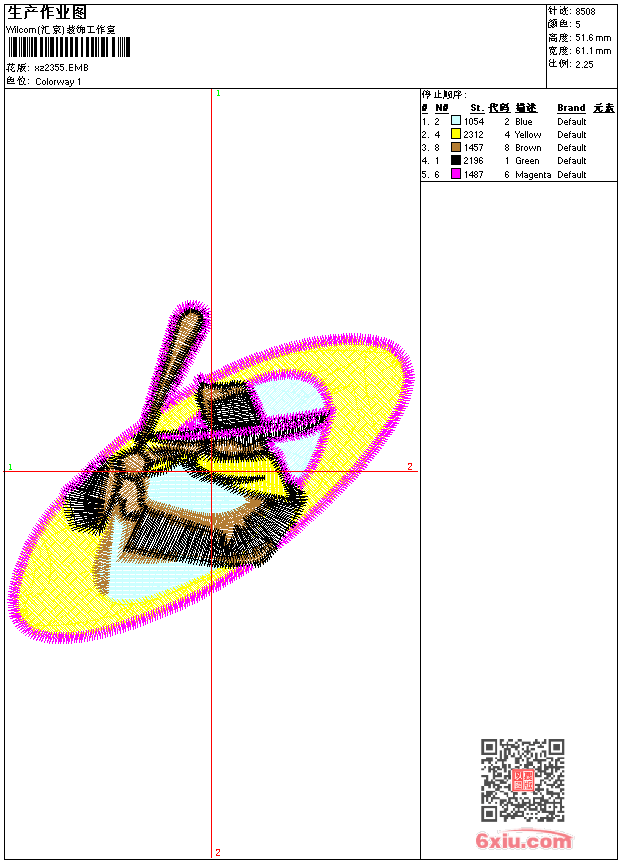 - emb花版参数: 大小:55.50 KB / 尺寸:61*52[毫米] / 针数:8508针 / 线色:5 / 格式:emb / 版本:9