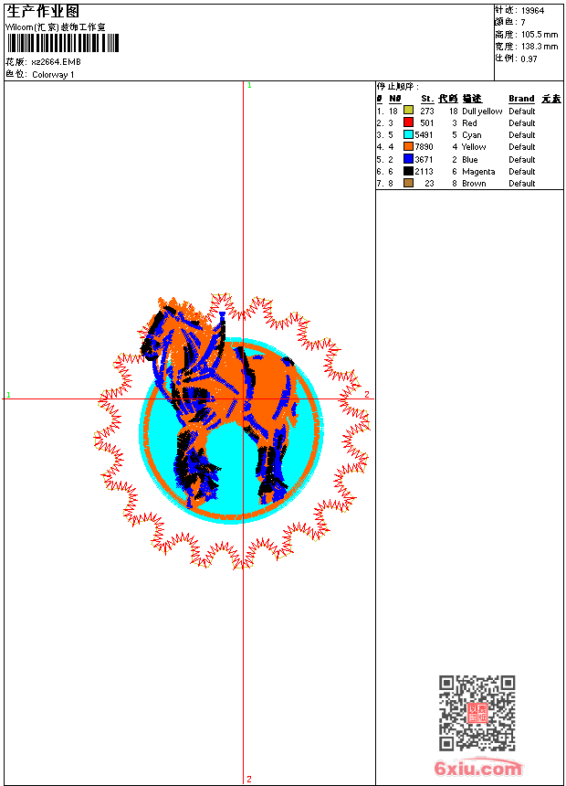 - emb花版参数: 大小:125.50 KB / 尺寸:138*106[毫米] / 针数:19964针 / 线色:7 / 格式:emb / 版本:9