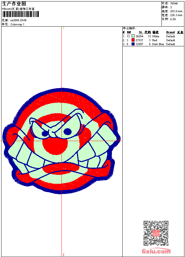 - emb花版参数: 大小:164.00 KB / 尺寸:226*203[毫米] / 针数:76540针 / 线色:3 / 格式:emb / 版本:9