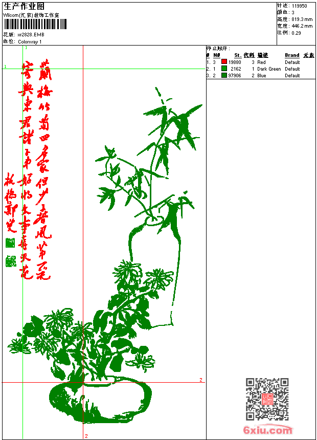 梅兰竹菊 精品 字画 诗 点此上传花版兑乐绣币/现金 emb花版参数: 大小:446.50 KB / 尺寸:446*819[毫米] / 针数:119950针 / 线色:3 / 格式:emb / 版本:9 版带文件需绣花软件方可打开,可配色打印导出各种格式或直接上机绣。如无绣花软件可下载1:1模拟效果图。 PNG图片信息:大小:2.2(MB) /图宽*高:1688x3100(像素) emb下载 1:1图下载 关闭 相似花版: 鞋垫 凤凰 鞋垫 猴子 鞋垫 马 鞋垫 靓花 鸟 凤凰 靓花 龙 靓花 莲花 荷花 禅 佛 保罗 骑马 polo 男 领 孔雀 靓花 靓花 靓花 孔雀 靓花 鸟 梅花 鸟 上一个花样:保罗 骑马 polo 男 下一个花样:鞋垫 凤凰
