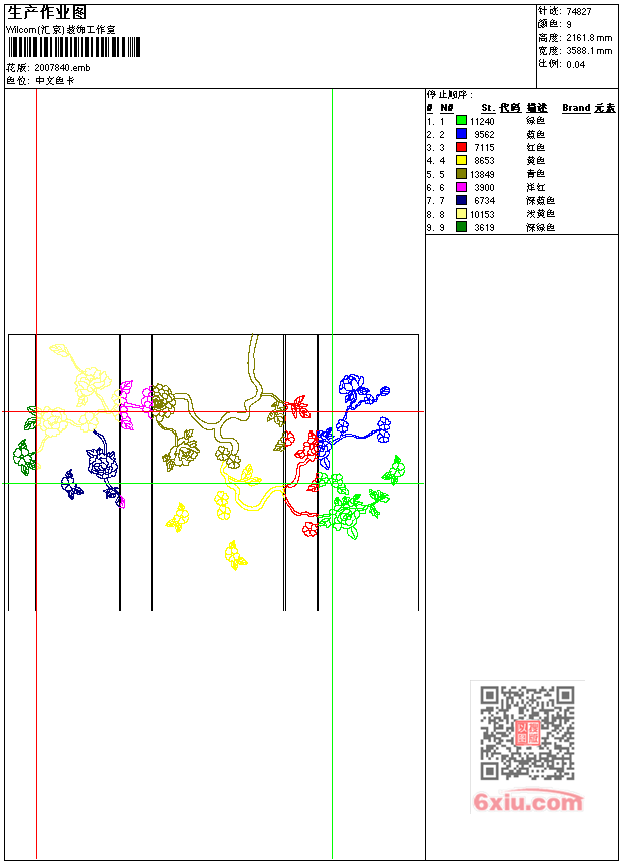 - emb花版参数: 大小:266.50 KB / 尺寸:3588*2162[毫米] / 针数:74827针 / 线色:9 / 格式:emb / 版本:e2