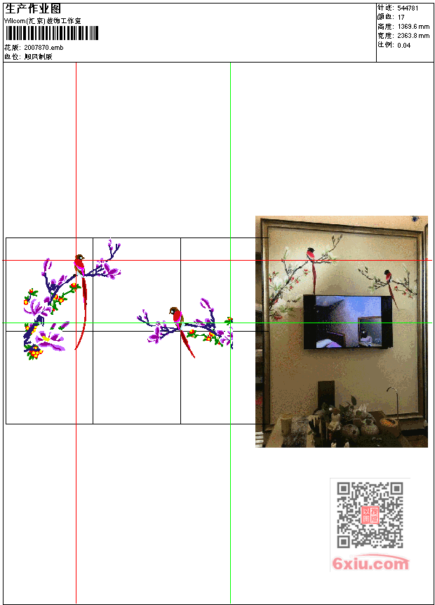 - emb花版参数: 大小:2.35 MB / 尺寸:2364*1370[毫米] / 针数:544781针 / 线色:17 / 格式:emb / 版本:9