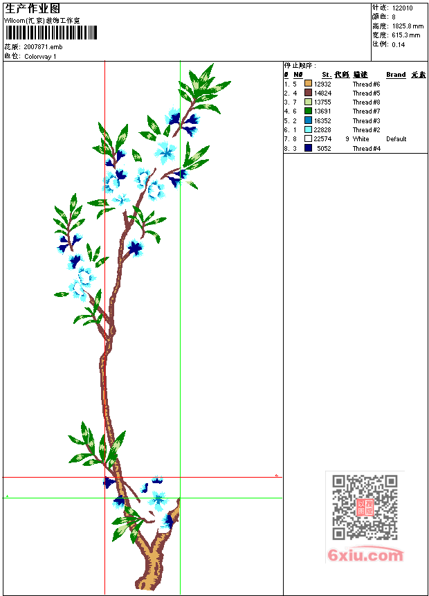 - emb花版参数: 大小:473.50 KB / 尺寸:615*1826[毫米] / 针数:122010针 / 线色:8 / 格式:emb / 版本:2006