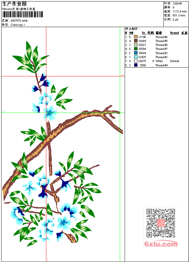 - emb花版参数: 大小:466.50 KB / 尺寸:651*1114[毫米] / 针数:126049针 / 线色:8 / 格式:emb / 版本:2006