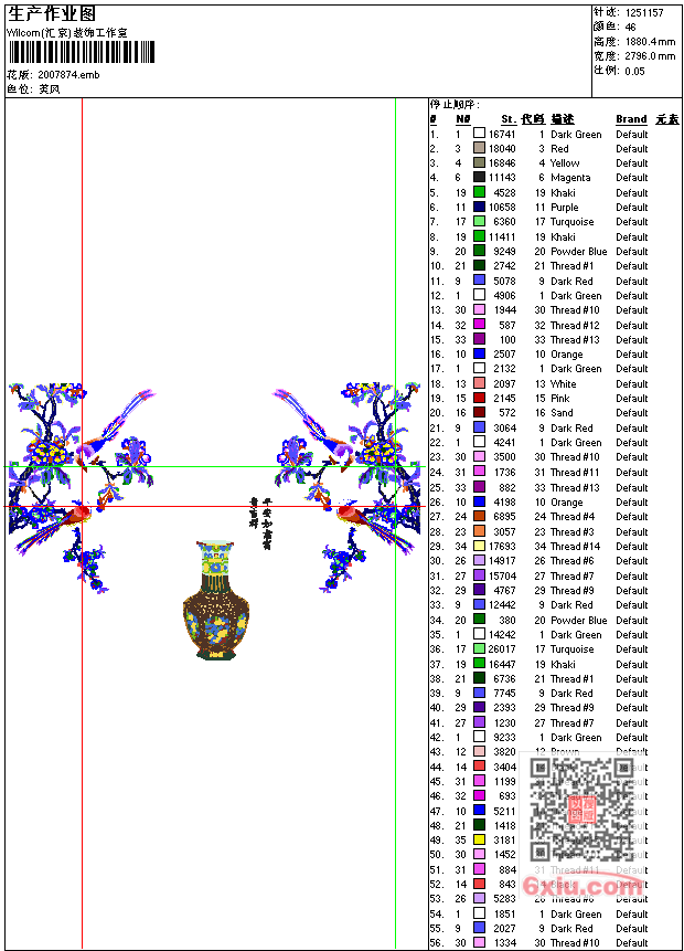 - emb花版参数: 大小:5.45 MB / 尺寸:2796*1880[毫米] / 针数:1251157针 / 线色:46 / 格式:emb / 版本:2006