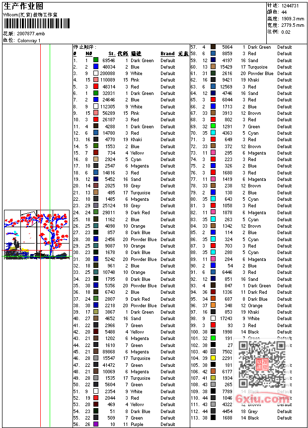 - emb花版参数: 大小:4.66 MB / 尺寸:2780*1909[毫米] / 针数:1244731针 / 线色:44 / 格式:emb / 版本:9
