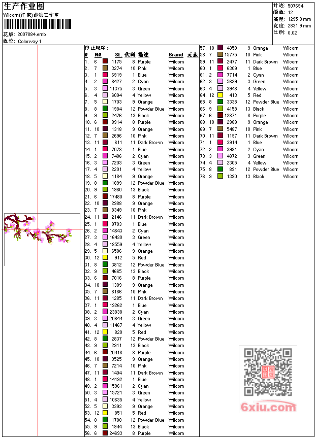 - emb花版参数: 大小:2.04 MB / 尺寸:2832*1295[毫米] / 针数:507694针 / 线色:12 / 格式:emb / 版本:e3