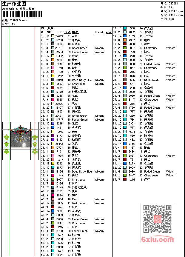 - emb花版参数: 大小:5.63 MB / 尺寸:2460*2094[毫米] / 针数:717084针 / 线色:24 / 格式:emb / 版本:e2