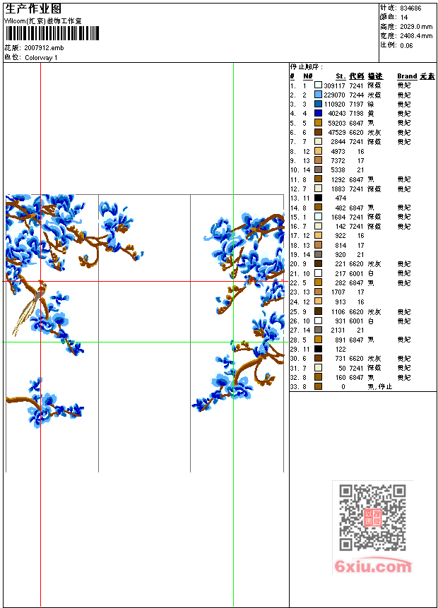 - emb花版参数: 大小:3.28 MB / 尺寸:2408*2029[毫米] / 针数:834686针 / 线色:14 / 格式:emb / 版本:e2