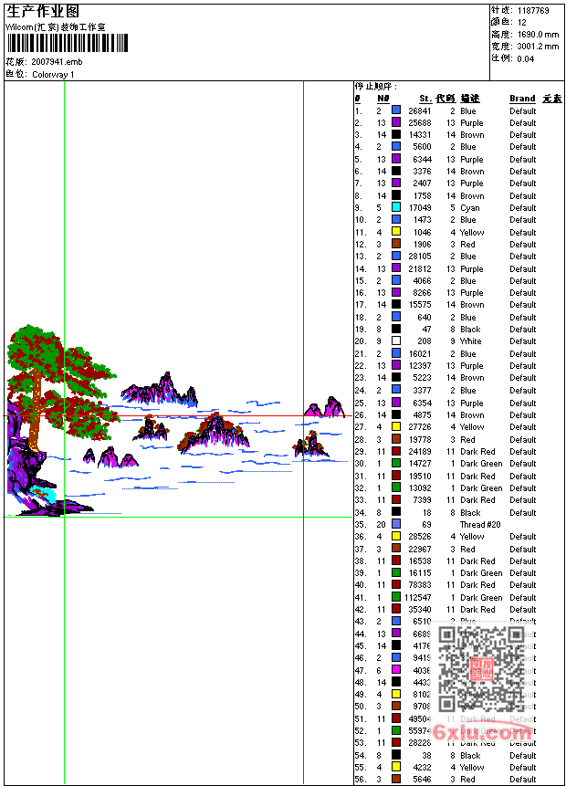 - emb花版参数: 大小:5.05 MB / 尺寸:3001*1690[毫米] / 针数:1187769针 / 线色:12 / 格式:emb / 版本:e2.0