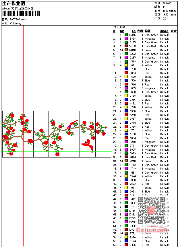 - emb花版参数: 大小:3.63 MB / 尺寸:4684*1899[毫米] / 针数:989485针 / 线色:11 / 格式:emb / 版本:2006