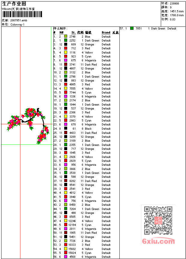 - emb花版参数: 大小:1.29 MB / 尺寸:1780*1451[毫米] / 针数:239908针 / 线色:9 / 格式:emb / 版本:e2.0
