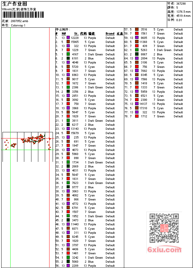 - emb花版参数: 大小:1.50 MB / 尺寸:4519*1377[毫米] / 针数:367298针 / 线色:5 / 格式:emb / 版本:e2.0