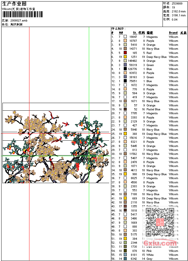 - emb花版参数: 大小:14.56 MB / 尺寸:3198*2182[毫米] / 针数:2539889针 / 线色:19 / 格式:emb / 版本:e2