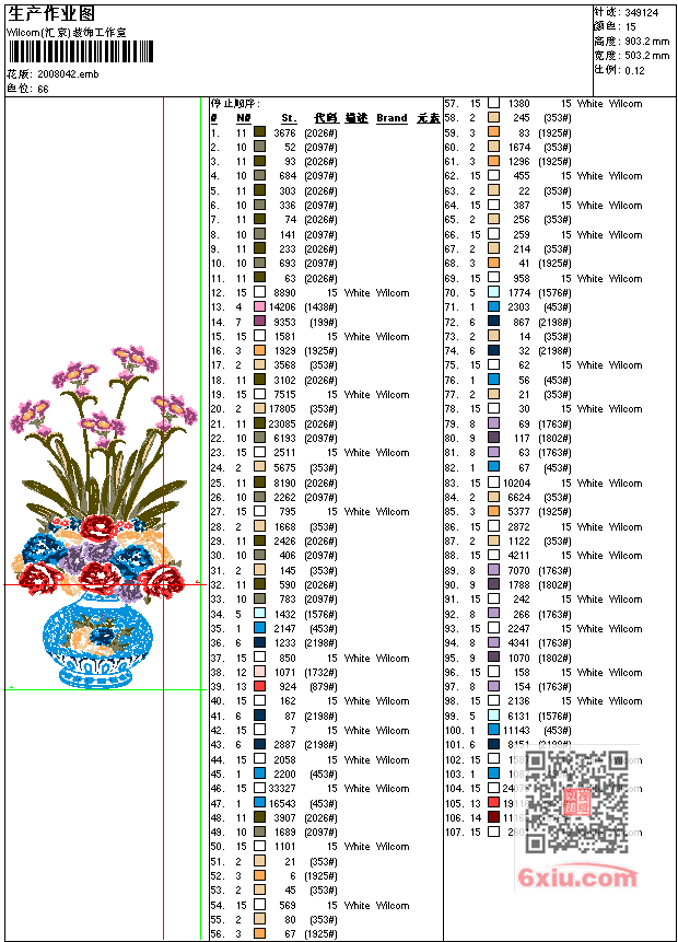 - emb花版参数: 大小:3.89 MB / 尺寸:503*903[毫米] / 针数:349124针 / 线色:15 / 格式:emb / 版本:e2.0