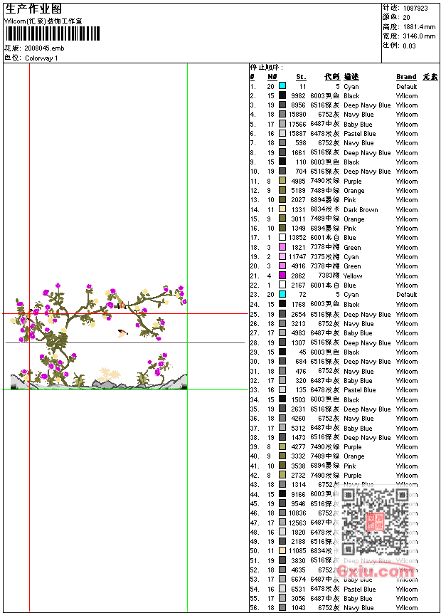 - emb花版参数: 大小:5.29 MB / 尺寸:3146*1881[毫米] / 针数:1087923针 / 线色:20 / 格式:emb / 版本:e2