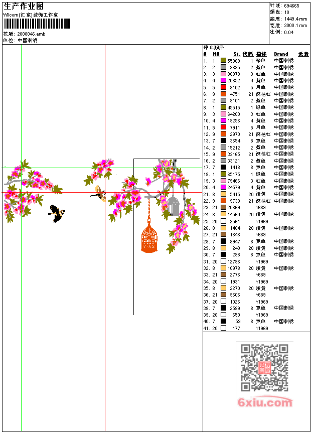 - emb花版参数: 大小:1.94 MB / 尺寸:3000*1449[毫米] / 针数:694665针 / 线色:10 / 格式:emb / 版本:e2