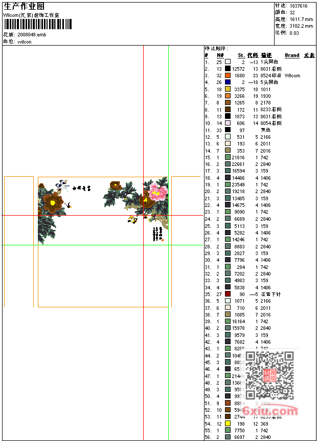 - emb花版参数: 大小:7.18 MB / 尺寸:3102*1612[毫米] / 针数:1837616针 / 线色:32 / 格式:emb / 版本:e2
