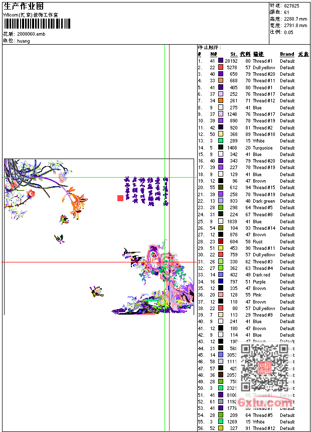 - emb花版参数: 大小:3.85 MB / 尺寸:2792*2281[毫米] / 针数:827825针 / 线色:61 / 格式:emb / 版本:e2