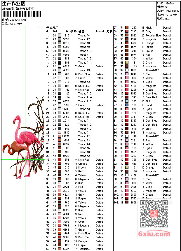 - emb花版参数: 大小:2.26 MB / 尺寸:728*1457[毫米] / 针数:396384针 / 线色:53 / 格式:emb / 版本:e2