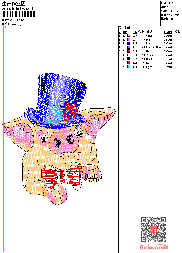 猪头 点此上传花版兑乐绣币/现金 emb花版参数: 大小:70.00 KB / 尺寸:46*54[毫米] / 针数:6632针 / 线色:8 / 格式:emb / 版本:e2 版带文件需绣花软件方可打开,可配色打印导出各种格式或直接上机绣。如无绣花软件可下载1:1模拟效果图。 PNG图片信息:大小:0.1(MB) /图宽*高:174x203(像素) emb下载 1:1图下载 关闭 相似花版: 猪头 猫 鹤 兔子 猫头 龙凤 豹头 简单花 汉服 虎 官府 回避 肃静 狗 雪橇 汉服 简单花 老虎 翅膀 梅花鹿 鸟 鸟 靓花 汉服 龙头 汉服 汉服 上一个花样:猪头 下一个花样:猪头