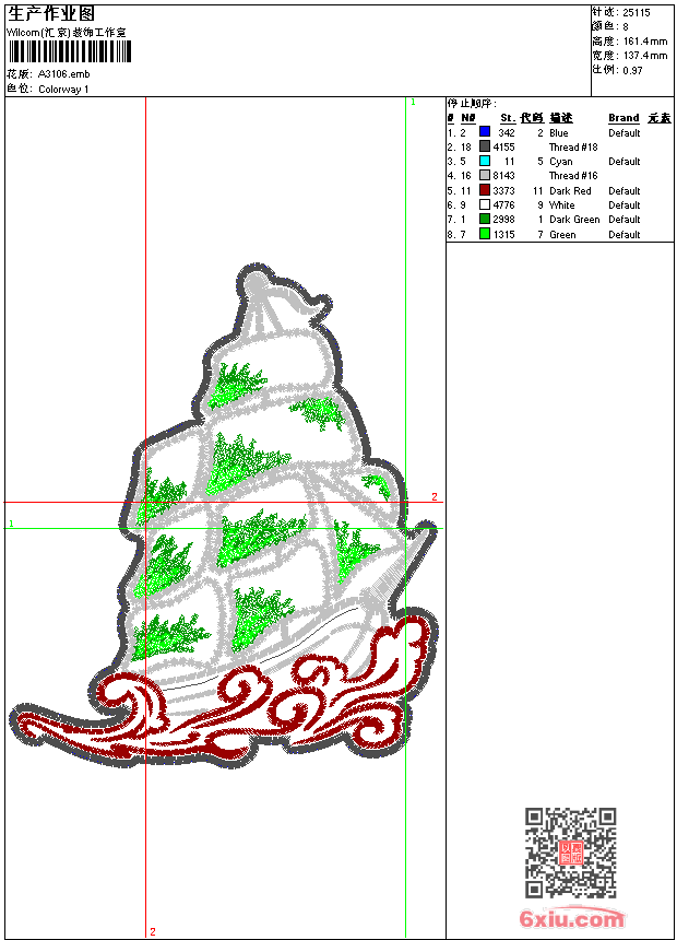 船 一帆风顺 点此上传花版兑乐绣币/现金 emb花版参数: 大小:167.50 KB / 尺寸:137*161[毫米] / 针数:25115针 / 线色:8 / 格式:emb / 版本:e2 版带文件需绣花软件方可打开,可配色打印导出各种格式或直接上机绣。如无绣花软件可下载1:1模拟效果图。 PNG图片信息:大小:0.4 (MB) /图宽*高:520x611(像素) emb下载 1:1图下载 关闭 相似花版: 抽象 鸟人 王冠 王冠 鹰人 鹰 龙 变色龙 鹤 圆形 王冠 河马 章仔 长颈鹿 马 章仔 章仔 章仔 骷髅 美女 章仔 猫星人 王冠 上一个花样:鸟 珠片 鹦鹉 下一个花样:抽象