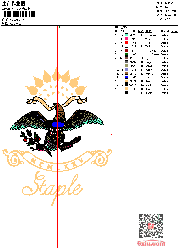 鹰 点此上传花版兑乐绣币/现金 emb花版参数: 大小:658.50 KB / 尺寸:325*406[毫米] / 针数:101007针 / 线色:14 / 格式:emb / 版本:9 版带文件需绣花软件方可打开,可配色打印导出各种格式或直接上机绣。如无绣花软件可下载1:1模拟效果图。 PNG图片信息:大小:1.1 (MB) /图宽*高:1231x1535(像素) emb下载 1:1图下载 关闭 相似花版: 抽象 抽象 骷髅 楼台亭阁 风景 汉服 树 鹤 梅花 梅花 麒麟 鸡 公鸡 物品 物品 翅膀 昆虫 抽象 鲤鱼 中国传统年画 鲤鱼 中国传统年画 汉服 狼 荷花 荷花 鲤鱼 靓花 上一个花样:骷髅 下一个花样:抽象