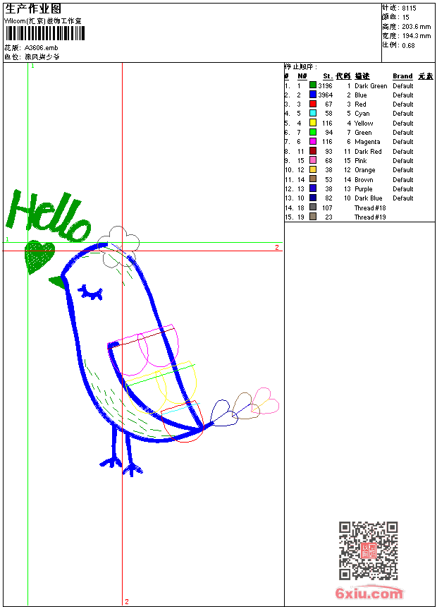 鸟 点此上传花版兑乐绣币/现金 emb花版参数: 大小:63.00 KB / 尺寸:194*204[毫米] / 针数:8115针 / 线色:15 / 格式:emb / 版本:e2 版带文件需绣花软件方可打开,可配色打印导出各种格式或直接上机绣。如无绣花软件可下载1:1模拟效果图。 PNG图片信息:大小:0.1 (MB) /图宽*高:735x771(像素) emb下载 1:1图下载 关闭 相似花版: 童 章标 蜜蜂 章标 蜜蜂 章标 蜜蜂 章标 蜜蜂 章标 章标 章标 蜜蜂 扇子 飞机 飞机 宇宙 靓花 简单花 简单花 简单花 简单花 蝴蝶 上一个花样:蝴蝶 下一个花样:童