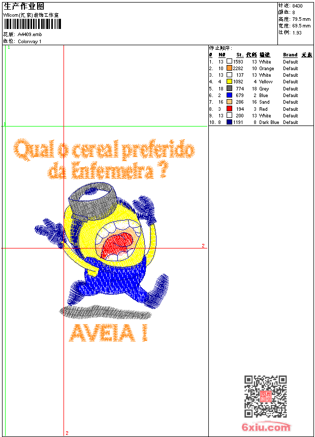 小黄人 点此上传花版兑乐绣币/现金 emb花版参数: 大小:80.50 KB / 尺寸:69*79[毫米] / 针数:8430针 / 线色:8 / 格式:emb / 版本:e2 版带文件需绣花软件方可打开,可配色打印导出各种格式或直接上机绣。如无绣花软件可下载1:1模拟效果图。 PNG图片信息:大小:0.1 (MB) /图宽*高:263x301(像素) emb下载 1:1图下载 关闭 相似花版: 鸟 中国空降兵 nike 车标 五菱通用 章标 靓花 斑马 凤凰 袋鼠 美团外卖 靓花 车标 威马 虎头 靓花 靓花 靓花 靓花 狗 靓花 十字绣 靓花 上一个花样:车标 丰田 reiz 下一个花样:鸟
