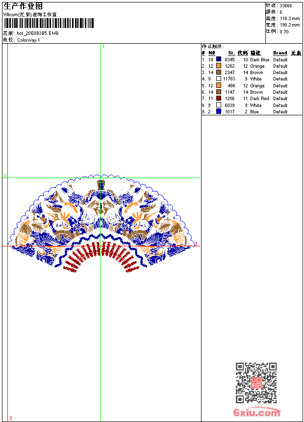 扇子 点此上传花版兑乐绣币/现金 emb花版参数: 大小:206.50 KB / 尺寸:190*118[毫米] / 针数:33666针 / 线色:6 / 格式:emb / 版本:e2 版带文件需绣花软件方可打开,可配色打印导出各种格式或直接上机绣。如无绣花软件可下载1:1模拟效果图。 PNG图片信息:大小:0.5 (MB) /图宽*高:720x448(像素) emb下载 1:1图下载 关闭 相似花版: 鸟 猪 野猪 靓花 汉服 插针花 人物 岳飞 武将 豹头 靓花 座 台布 鸟 鸟 梅花鹿 蝴蝶 靓花 鞋垫 鸟 圆火 虎头 龙 汉服 上一个花样:鞋垫马 下一个花样:鸟