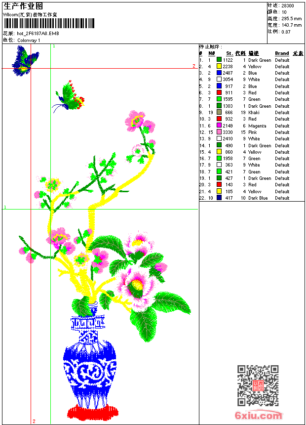 花瓶 靓花 点此上传花版兑乐绣币/现金 emb花版参数: 大小:234.50 KB / 尺寸:144*296[毫米] / 针数:28300针 / 线色:10 / 格式:emb / 版本:e2 版带文件需绣花软件方可打开,可配色打印导出各种格式或直接上机绣。如无绣花软件可下载1:1模拟效果图。 PNG图片信息:大小:0.4 (MB) /图宽*高:544x1118(像素) emb下载 1:1图下载 关闭 相似花版: 汉服 梅花鹿 骷髅玫瑰花 鹰标 牛羊 花条 圆抽象 靓花 十字绣 靓花 鸟 花瓶 靓花 旗袍 狮标 狗 鞋垫 十字绣 靓花 汉服 蜜蜂 鲤鱼 靓花 旗袍 简单花 上一个花样:龙 下一个花样:汉服