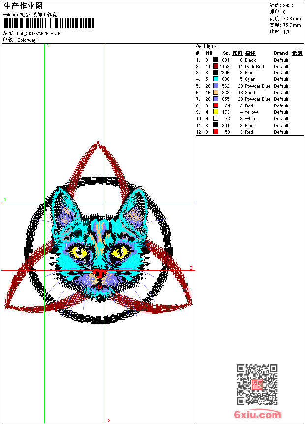 猫头 点此上传花版兑乐绣币/现金 emb花版参数: 大小:79.50 KB / 尺寸:76*74[毫米] / 针数:8953针 / 线色:8 / 格式:emb / 版本:e2 版带文件需绣花软件方可打开,可配色打印导出各种格式或直接上机绣。如无绣花软件可下载1:1模拟效果图。 PNG图片信息:大小:0.1 (MB) /图宽*高:287x279(像素) emb下载 1:1图下载 关闭 相似花版: 汉服 靓花 猪 汉服 鹤 汉服 汉服 靓花 汉服 虎 美女骑老虎 金鱼 虎头 豹头 汉服 狼头 汉服 靓花 简单花 龙 花瓶 鬼怪鞋 上一个花样:猪 下一个花样:汉服