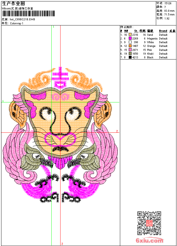 狮头 点此上传花版兑乐绣币/现金 emb花版参数: 大小:119.50 KB / 尺寸:72*84[毫米] / 针数:15126针 / 线色:7 / 格式:emb / 版本:e2 版带文件需绣花软件方可打开,可配色打印导出各种格式或直接上机绣。如无绣花软件可下载1:1模拟效果图。 PNG图片信息:大小:0.2 (MB) /图宽*高:271x317(像素) emb下载 1:1图下载 关闭 相似花版: 鸟语花香 靓花 旗袍 蝴蝶 汉服 汉服 保罗 虎 武将宋刀 鞋垫 凤凰 汉服 猩猩 猴 汉服 狼头标 汉服 汉服 鸟 汉服 龙王圆 抽象 范思哲 汉服 凤凰 汉服 男章标 上一个花样:梅花 下一个花样:鸟语花香