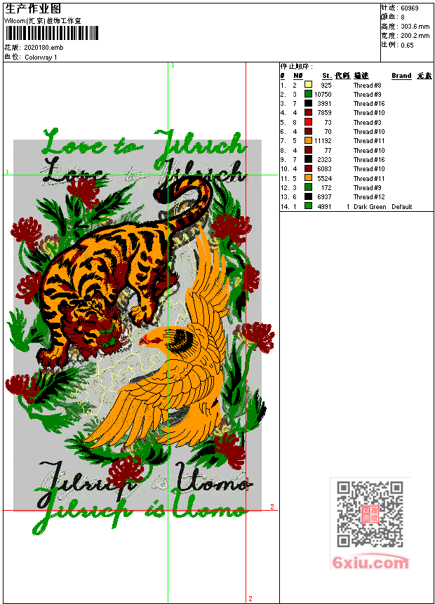 鹰 老虎 点此上传花版兑乐绣币/现金 emb花版参数: 大小:1.48 MB / 尺寸:200*304[毫米] / 针数:60969针 / 线色:8 / 格式:emb / 版本:e2 版带文件需绣花软件方可打开,可配色打印导出各种格式或直接上机绣。如无绣花软件可下载1:1模拟效果图。 PNG图片信息:大小:1.0 (MB) /图宽*高:758x1149(像素) emb下载 1:1图下载 关闭 相似花版: 龙 蜥蜴 章 男装 章仔 男装 章仔 龙 男装 章仔 鸟 男装 章仔 王冠 虎头 靓花 蝈蝈 豹子 鲤鱼 靓花 靓花 狗头 鸟 鸟 鸟 鹤 老虎 上一个花样:男装 章仔 下一个花样:龙 蜥蜴 章